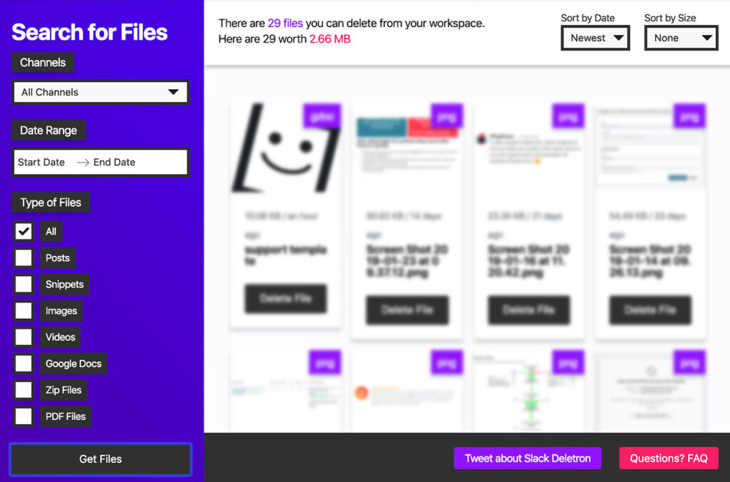 An essential app for anyone still on the free version of Slack. Slack Deletron uses the Slack API to help you search, manage and delete files from your workspace. You can delete all or by file type.
