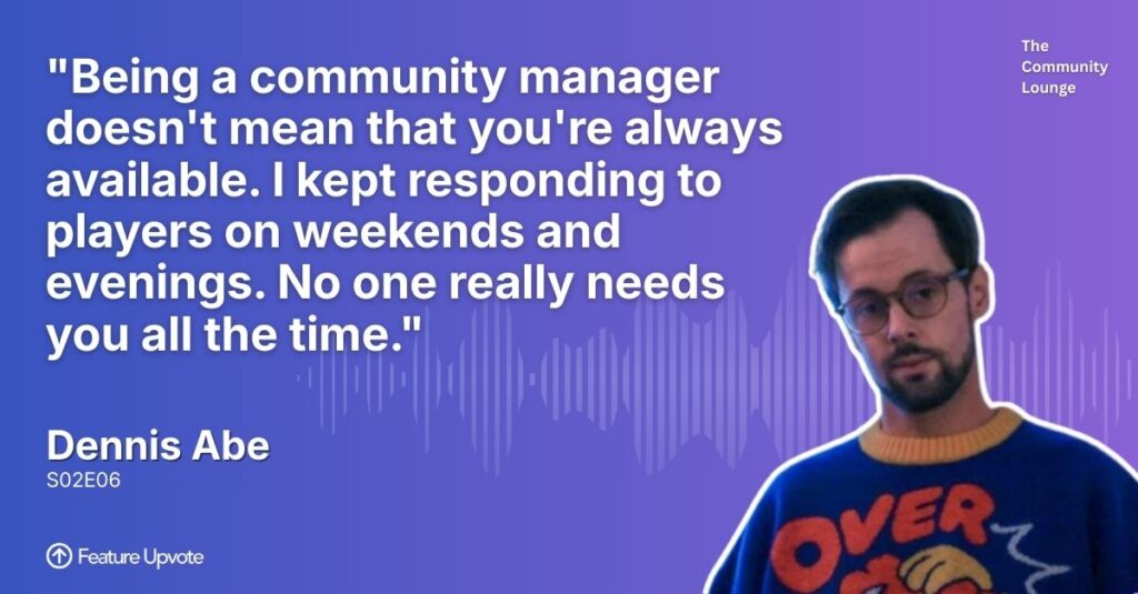 “Being a community manager doesn’t mean that you’re always available. I kept responding to players on weekends and evenings. No one really needs you all the time.” – Dennis Abe (S02E06)